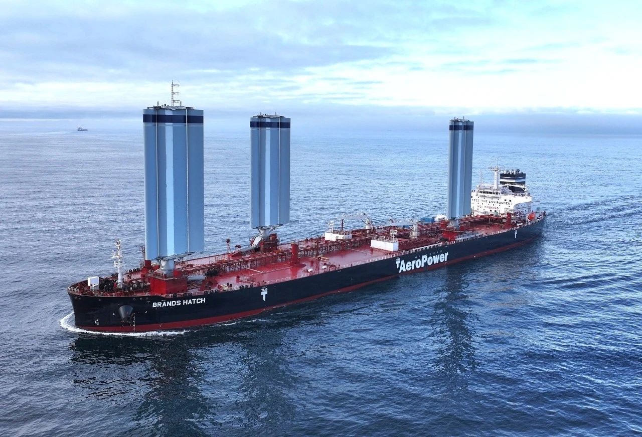 風(fēng)能作為一種可再生能源,以其高性價(jià)比成為業(yè)內(nèi)研究船舶推力的新方向。“BRANDSHATCH”號(hào)以將傳統(tǒng)風(fēng)能轉(zhuǎn)化為智能化現(xiàn)代推進(jìn)力為核心技術(shù)顛覆點(diǎn),配備三具高度超過40米的硬質(zhì)翼型風(fēng)帆,在航行中能夠依托數(shù)字控帆系統(tǒng)根據(jù)氣象數(shù)據(jù)實(shí)現(xiàn)實(shí)時(shí)智能動(dòng)態(tài)調(diào)整帆角,通過機(jī)械液壓傳動(dòng)系統(tǒng)實(shí)現(xiàn)升降、開合和旋轉(zhuǎn),為船舶提供額外推力,從而大幅減少主機(jī)的燃油消耗,有效提升船舶運(yùn)營(yíng)效能。