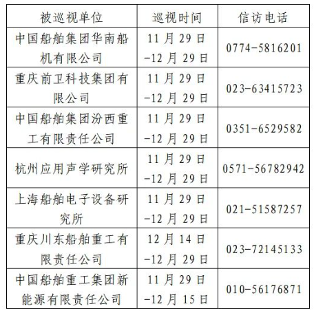 根據(jù)中國船舶集團黨組2023年第二輪巡視工作部署,截至2023年11月29日,巡視工作已經(jīng)鋪開。其中,對中國船舶集團華南船機有限公司、重慶前衛(wèi)科技集團有限公司、中國船舶集團汾西重工有限責(zé)任公司、杭州應(yīng)用聲學(xué)研究所、上海船舶電子設(shè)備研究所等5家單位開展常規(guī)巡視,對重慶川東船舶重工有限責(zé)任公司、中國船舶重工集團新能源有限責(zé)任公司等2家單位開展專項巡視。